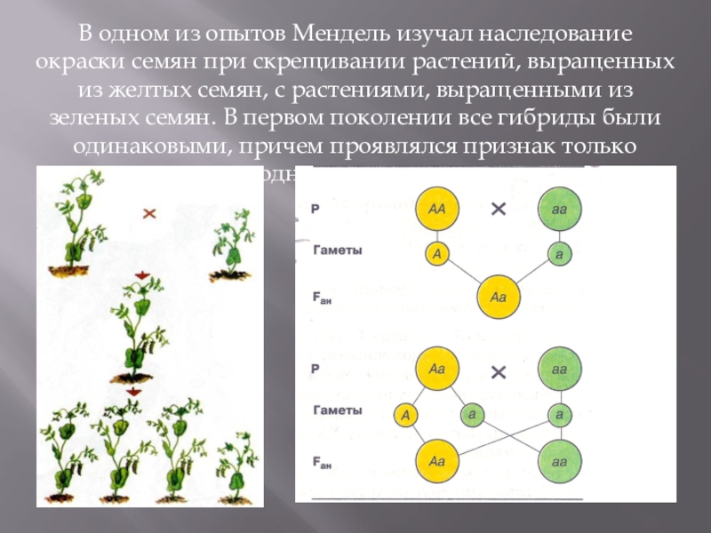растений, выращенных из желтых семян, с растениями, выращенными из зеленых семян. В первом поколении все гибриды были одинаковыми, причем проявлялся признак только одного родителя.