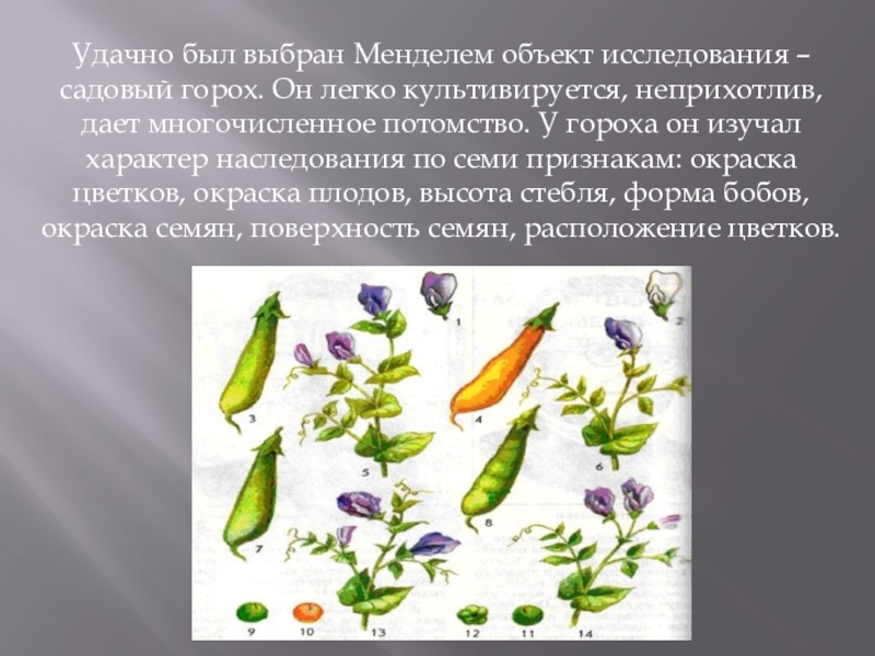 Удачно был выбран Менделем объект исследования – садовый горох. Он легко культивируется, неприхотлив, дает многочисленное потомство. У