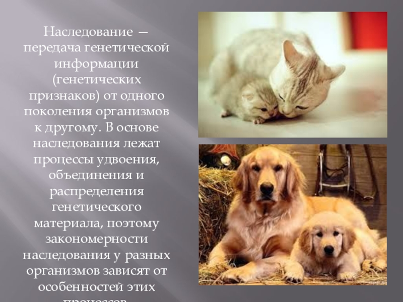 Наследование — передача генетической информации (генетических признаков) от одного поколения организмов к другому. В основе наследования лежат