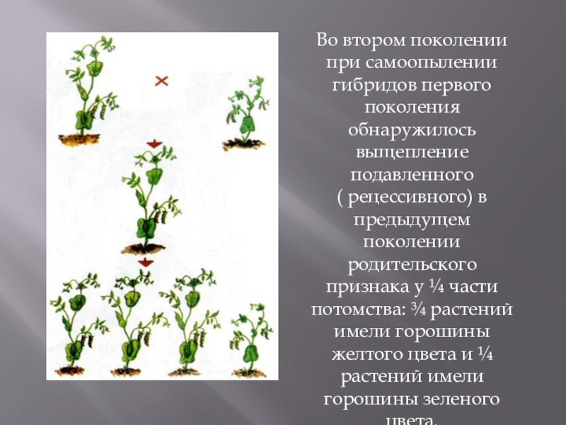 ( рецессивного) в предыдущем поколении родительского признака у ¼ части потомства: ¾ растений имели горошины желтого цвета и ¼ растений имели горошины зеленого цвета.