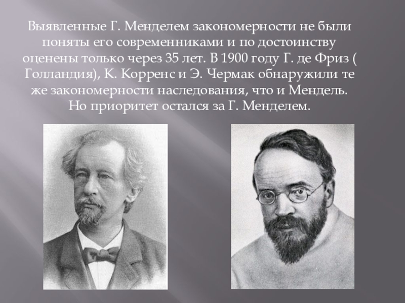 достоинству оценены только через 35 лет. В 1900 году Г. де Фриз ( Голландия), К. Корренс и Э. Чермак обнаружили те же закономерности наследования, что и Мендель. Но приоритет остался за Г. Менделем.