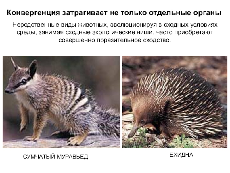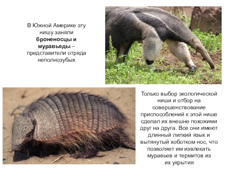 Только выбор экологической ниши и отбор на совершенствование приспособлений к этой нише сделал их внешне похожими друг на друга. Все они имеют длинный липкий язык и вытянутый хоботком нос, что позволяет им извлекать муравьев и термитов из