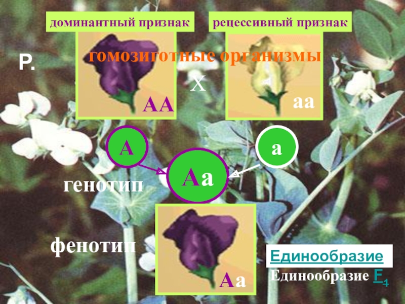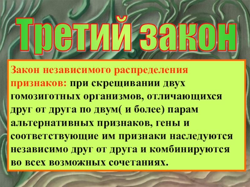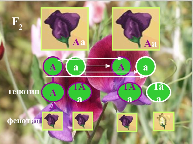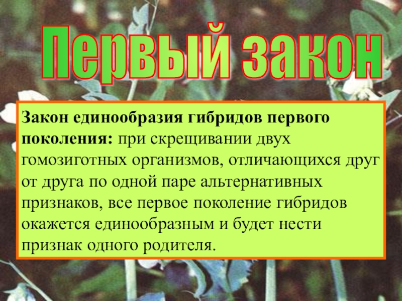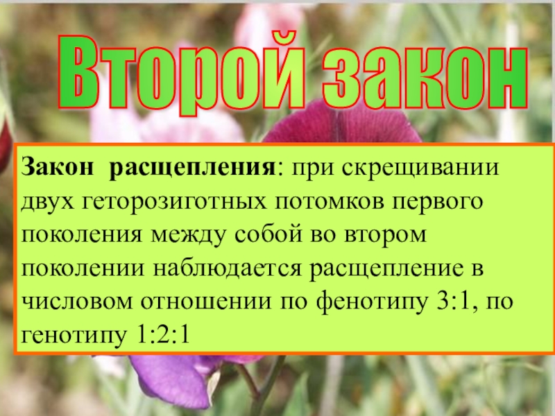 Закон расщепления: при скрещивании двух геторозиготных потомков первого поколения между собой во втором поколении наблюдается расщепление в числовом отношении по фенотипу 3:1, по генотипу 1:2:1