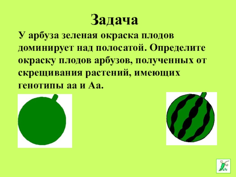 Ответ: в F1 1/2 растений будет с зеленой окраской плодов и 1/2 – полосатых