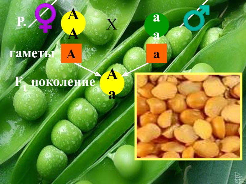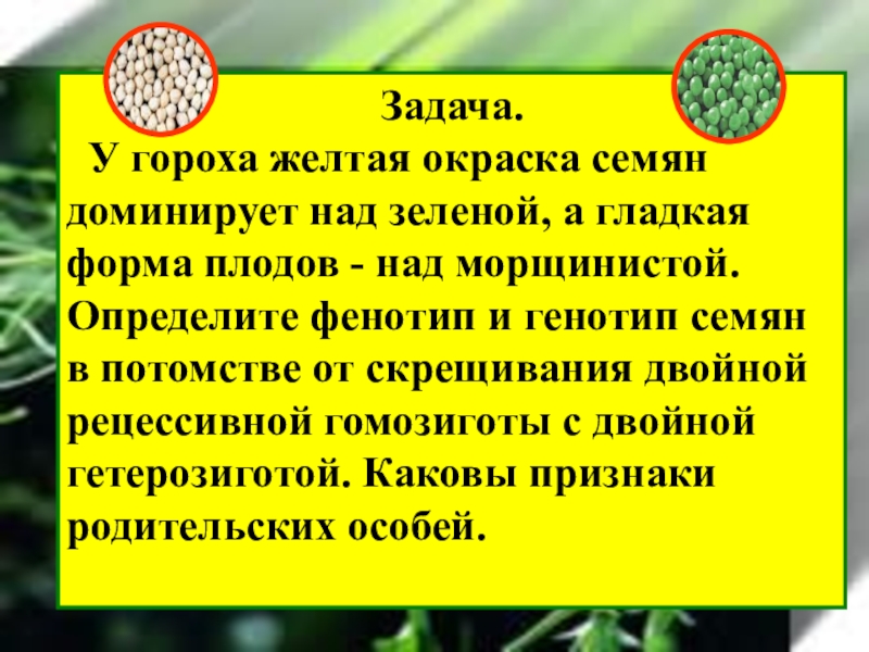 фенотип семян: желтые гладкие, желтые морщинистые,