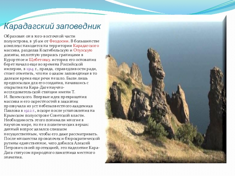 В большинстве комплекс находится на территории Карадагского массива, разделяя Коктебельскую и Отузскую долины, вплотную упираясь границами в Курортное и Щебетовку. история его основания берет начало еще во времена Российской империи, в 1914 г., правда, справедливости ради, стоит отметить, что ни о каком заповеднике в то далекое время еще речи не шло. Были лишь предпосылки для его создания, начавшись с открытия на Кара-Даге научно-исследовательской станции имени Т.И. Вяземского. Впервые идея превращения массива и его окрестностей в заказник прозвучала из уст небезызвестного академика Павлова в 1922 г., вскоре после установления на Крымском полуострове Советской власти. Необходимость этого понимали многие в научном мире, но не в политических верхах: данный вопрос казался слишком несущественным, чтобы его даже рассматривать. После множества проволочек и бюрократической рутины единственное, чего добился Алексей Петрович своей протекцией, это наделение Кара-Дага статусом природного памятника местного значения.