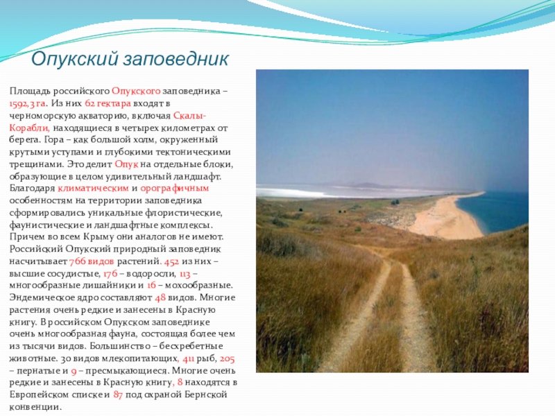 гектара входят в черноморскую акваторию, включая Скалы-Корабли, находящиеся в четырех километрах от берега. Гора – как большой холм, окруженный крутыми уступами и глубокими тектоническими трещинами. Это делит Опук на отдельные блоки, образующие в целом удивительный ландшафт. Благодаря климатическим и орографичным особенностям на территории заповедника сформировались уникальные флористические, фаунистические и ландшафтные комплексы. Причем во всем Крыму они аналогов не имеют. Российский Опукский природный заповедник насчитывает 766 видов растений. 452 из них – высшие сосудистые, 176 – водоросли, 113 – многообразные лишайники и 16 – мохообразные. Эндемическое ядро составляют 48 видов. Многие растения очень редкие и занесены в Красную книгу. В российском Опукском заповеднике очень многообразная фауна, состоящая более чем из тысячи видов. Большинство – бесхребетные животные. 30 видов млекопитающих, 411 рыб, 205 – пернатые и 9 – пресмыкающиеся. Многие очень редкие и занесены в Красную книгу, 8 находятся в Европейском списке и 87 под охраной Бернской конвенции.