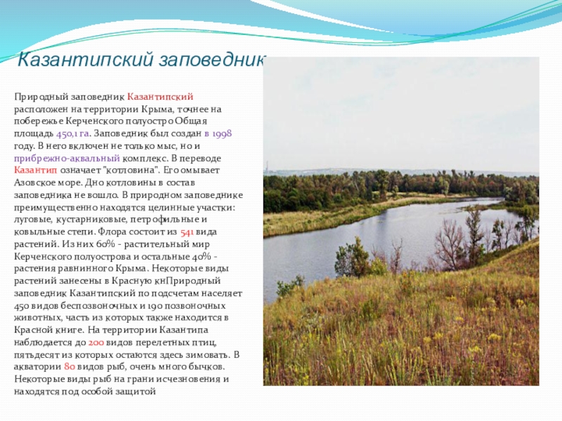 Керченского полуостро Общая площадь 450,1 га. Заповедник был создан в 1998 году. В него включен не только мыс, но и прибрежно-аквальный комплекс. В переводе Казантип означает "котловина". Его омывает Азовское море. Дно котловины в состав заповедника не вошло. В природном заповеднике преимущественно находятся целинные участки: луговые, кустарниковые, петрофильные и ковыльные степи. Флора состоит из 541 вида растений. Из них 60% - растительный мир Керченского полуострова и остальные 40% - растения равнинного Крыма. Некоторые виды растений занесены в Красную кнПриродный заповедник Казантипский по подсчетам населяет 450 видов беспозвоночных и 190 позвоночных животных, часть из которых также находится в Красной книге. На территории Казантипа наблюдается до 200 видов перелетных птиц, пятьдесят из которых остаются здесь зимовать. В акватории 80 видов рыб, очень много бычков. Некоторые виды рыб на грани исчезновения и находятся под особой защитой