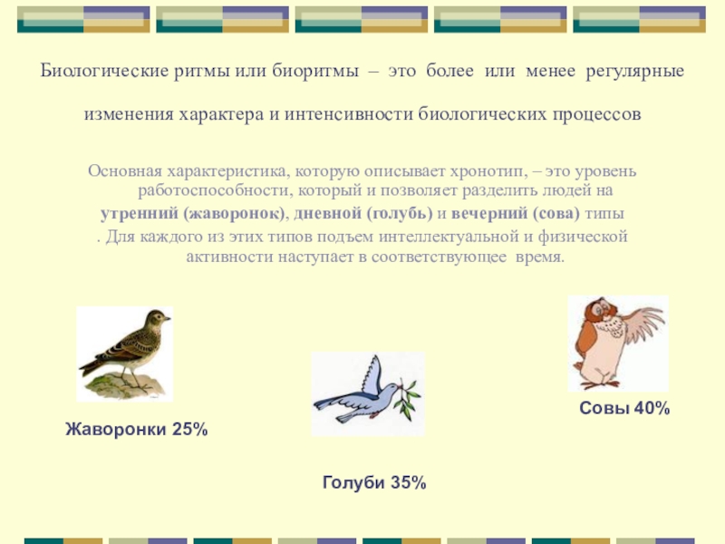 утренний (жаворонок), дневной (голубь) и вечерний (сова) типы