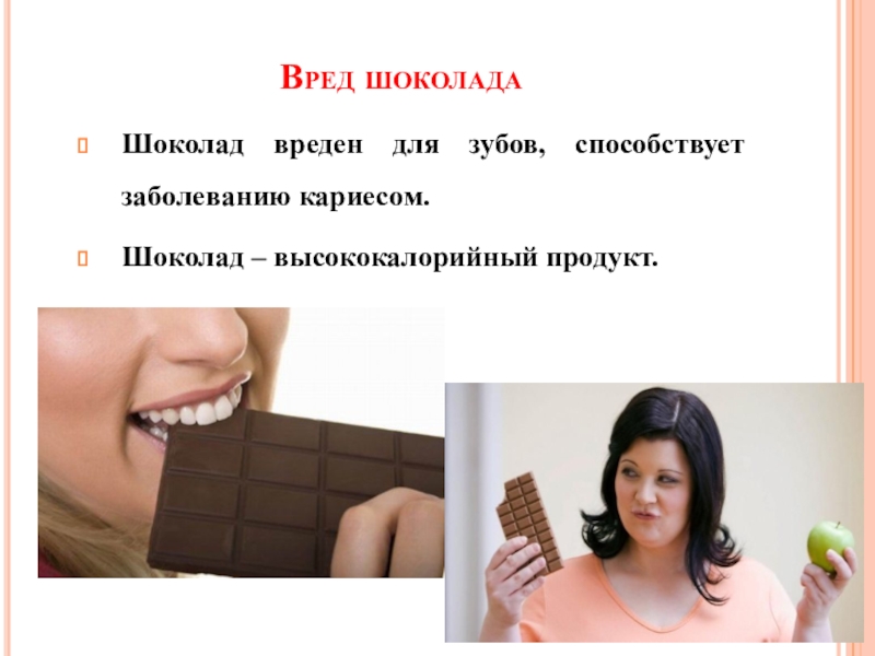 Шоколад вреден для зубов, способствует заболеванию кариесом.