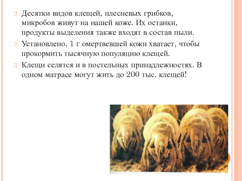 Слайд 60Десятки видов клещей, плесневых грибков, микробов живут на нашей коже. Их