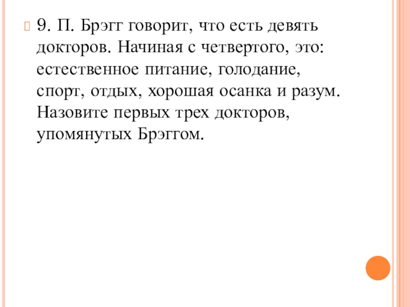 это: естественное питание, голодание, спорт, отдых, хорошая осанка и разум. Назовите первых трех докторов, упомянутых Брэггом.