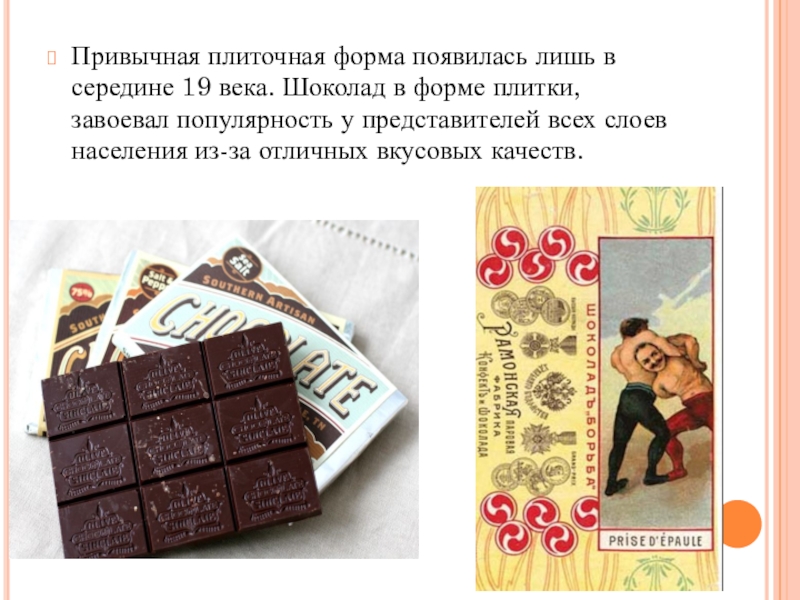 Слайд 25Привычная плиточная форма появилась лишь в середине 19 века. Шоколад в