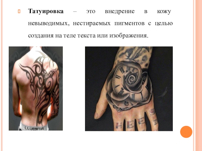 Слайд 18Татуировка – это внедрение в кожу невыводимых, нестираемых пигментов с целью