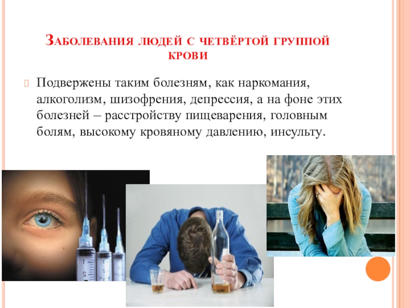 Подвержены таким болезням, как наркомания, алкоголизм,