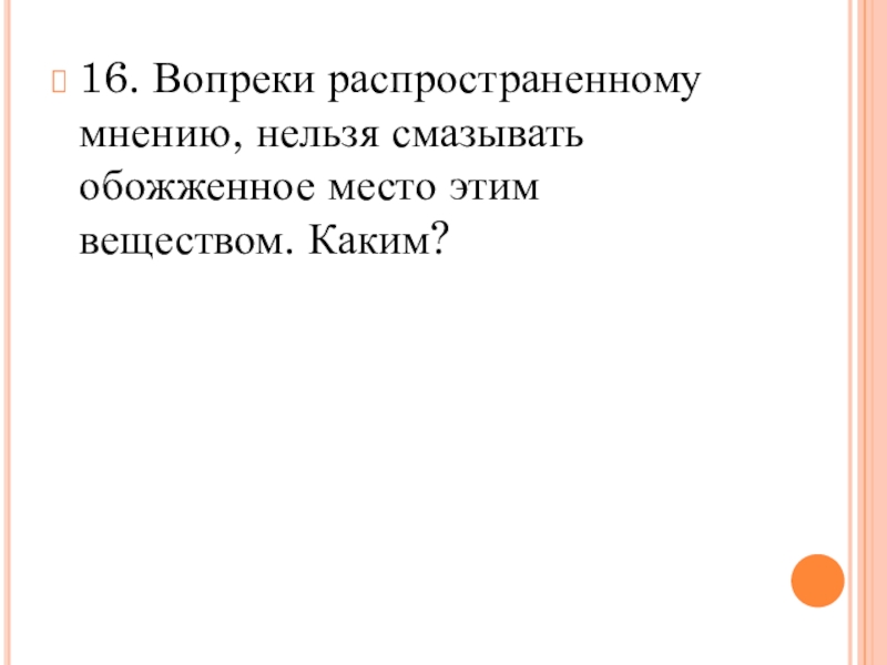 Слайд 9516. Вопреки распространенному мнению, нельзя смазывать обожженное место этим веществом. Каким?