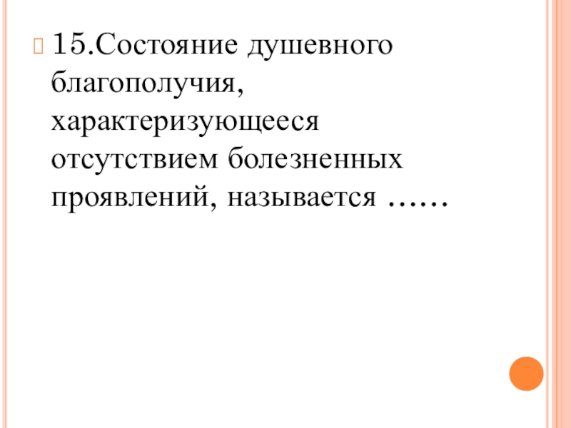 Слайд 9315.Состояние душевного благополучия, характеризующееся отсутствием болезненных проявлений, называется ……