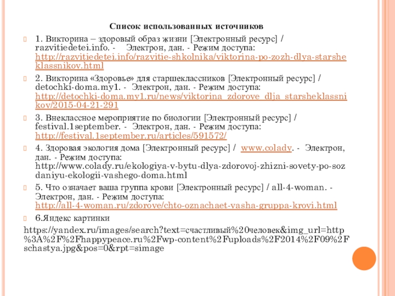 2. Викторина «Здоровье» для старшеклассников [Электронный ресурс] / detochki-doma.my1. - Электрон, дан. - Режим доступа: http://detochki-doma.my1.ru/news/viktorina_zdorove_dlja_starsheklassnikov/2015-04-21-291