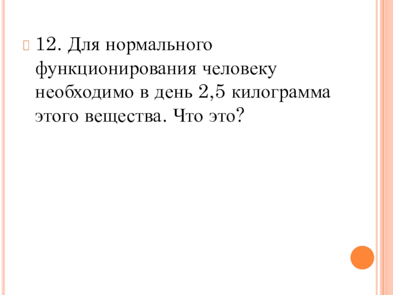 Слайд 8712. Для нормального функционирования человеку необходимо в день 2,5 килограмма этого