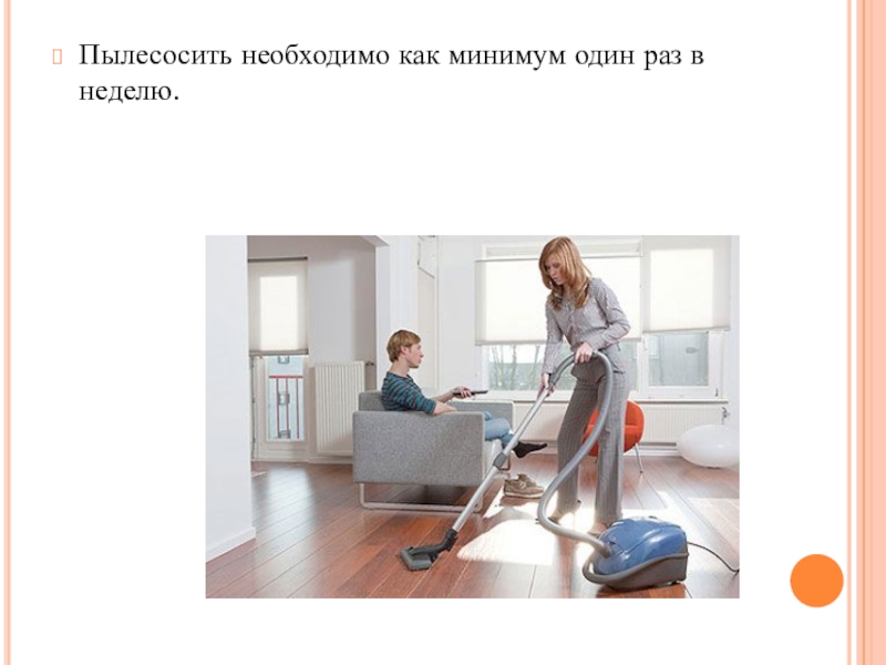 Слайд 62Пылесосить необходимо как минимум один раз в неделю.