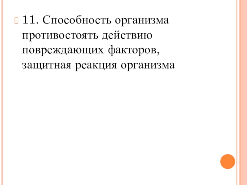 Слайд 8511. Способность организма противостоять действию повреждающих факторов, защитная реакция организма