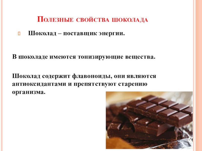 Шоколад содержит флавоноиды, они являются антиоксидантами и препятствуют старению организма.