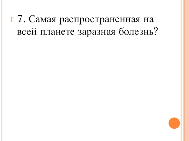 Слайд 777. Самая распространенная на всей планете заразная болезнь?