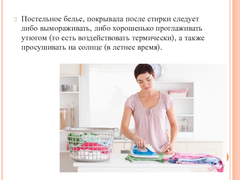 Слайд 64Постельное белье, покрывала после стирки следует либо вымораживать, либо хорошенько проглаживать