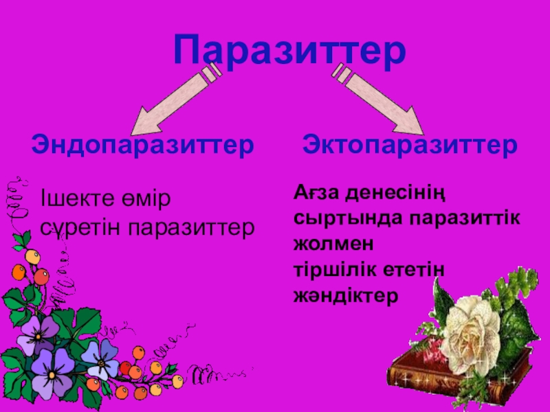 ПаразиттерЭндопаразиттерЭктопаразиттерІшекте өмір сүретін паразиттерАғза денесінің сыртында паразиттік жолмен тіршілік ететін жәндіктер