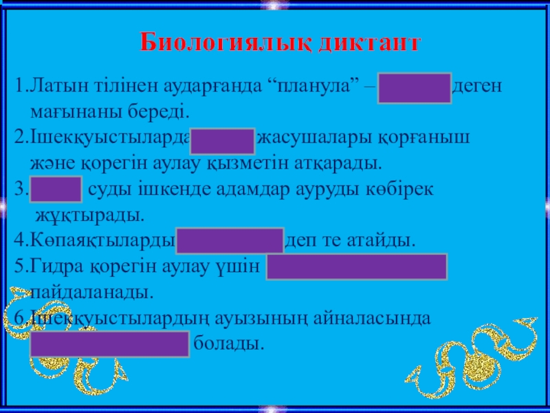 Биологиялық диктант1.Латын тілінен аударғанда “планула” – жалпақ деген  мағынаны береді.2.Ішекқуыстыларда (атпа) жасушалары қорғаныш  және қорегін