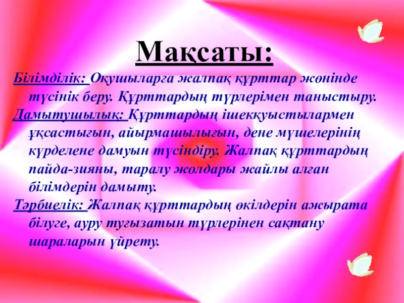 Білімділік: Оқушыларға жалпақ құрттар жөнінде түсінік беру. Құрттардың түрлерімен таныстыру.