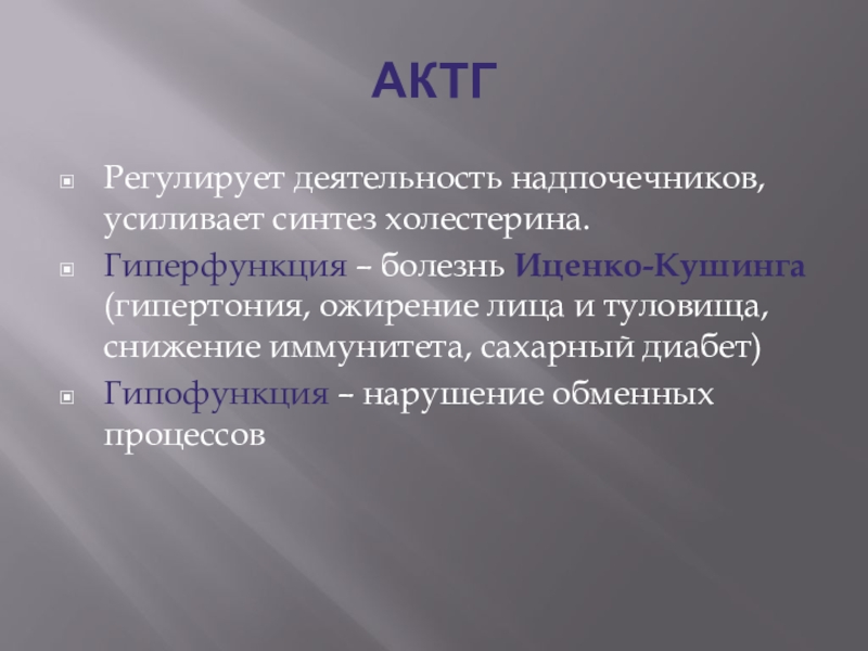 Гиперфункция (кортизон) – снижает обмен веществ, устойчивость организма к неблагоприятным факторам, ожирение.