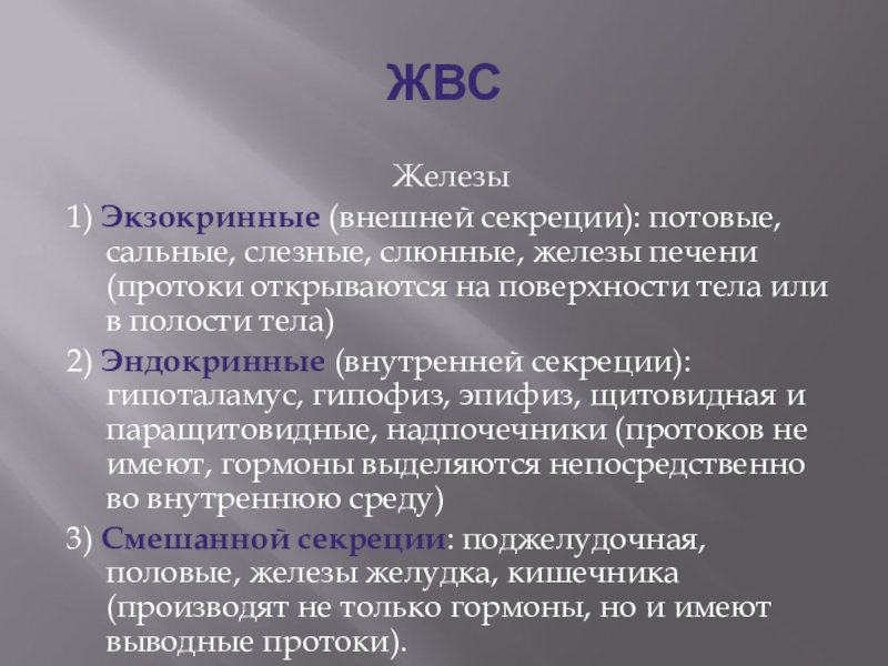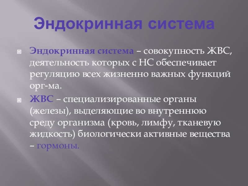 ЖВС – специализированные органы (железы), выделяющие во внутреннюю среду организма (кровь, лимфу, тканевую жидкость) биологически активные вещества – гормоны.