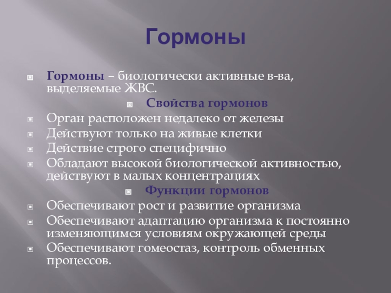 Гормоны – биологически активные в-ва, выделяемые ЖВС.