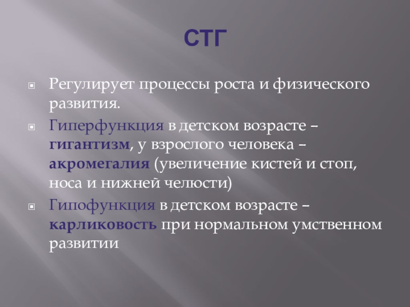 у взрослого человека – акромегалия (увеличение кистей и стоп, носа и нижней челюсти)