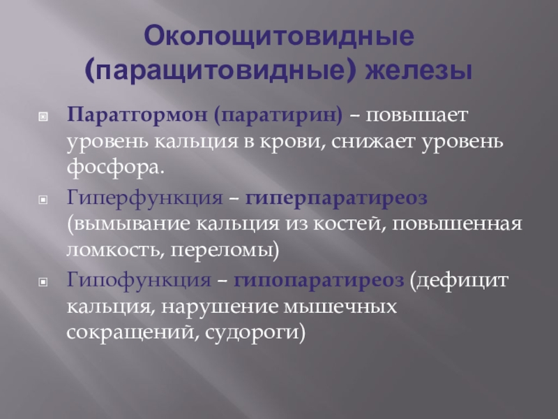 Гиперфункция – гиперпаратиреоз (вымывание кальция из костей, повышенная ломкость, переломы)