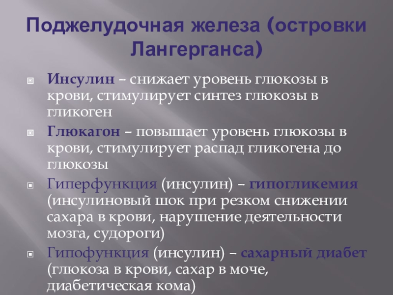 Гиперфункция (инсулин) – гипогликемия (инсулиновый шок при резком снижении сахара в крови, нарушение деятельности мозга, судороги)
