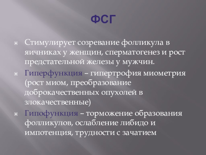 Стимулирует созревание фолликула в яичниках у женщин, сперматогенез и рост предстательной