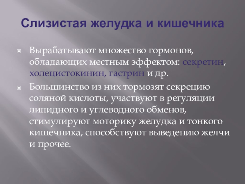 Большинство из них тормозят секрецию соляной кислоты, участвуют в регуляции липидного и углеводного обменов, стимулируют моторику желудка и тонкого кишечника, способствуют выведению желчи и прочее.