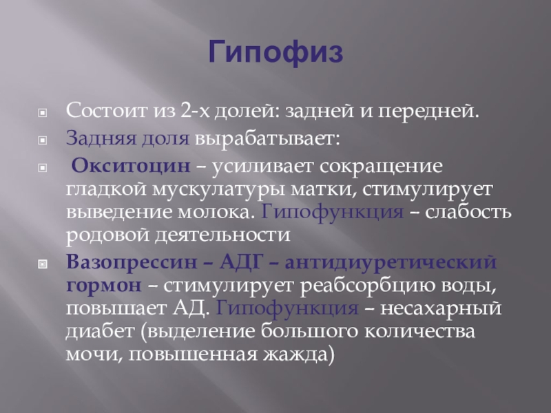 Вазопрессин – АДГ – антидиуретический гормон – стимулирует реабсорбцию воды, повышает АД. Гипофункция – несахарный диабет (выделение большого количества мочи, повышенная жажда)
