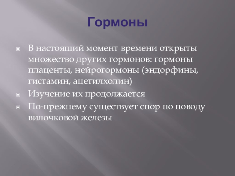 В настоящий момент времени открыты множество других гормонов: гормоны плаценты, нейрогормоны