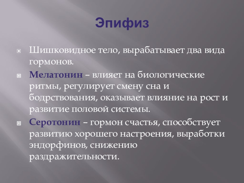 регулирует смену сна и бодрствования, оказывает влияние на рост и развитие половой системы.