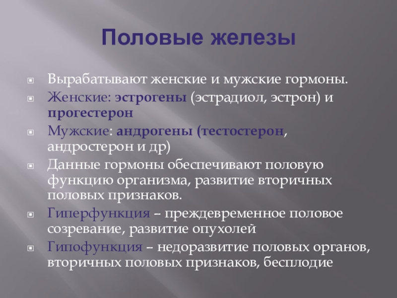 Данные гормоны обеспечивают половую функцию организма, развитие вторичных половых признаков.