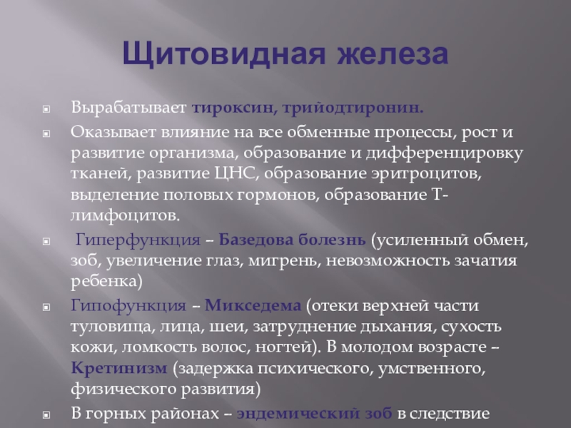 Гиперфункция – Базедова болезнь (усиленный обмен, зоб, увеличение глаз, мигрень, невозможность зачатия ребенка)