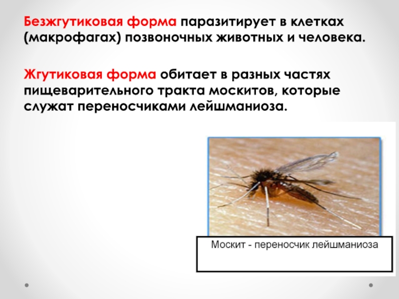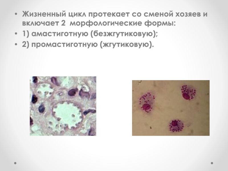 Слайд 6Безжгутиковая форма паразитирует в клетках (макрофагах) позвоночных животных и человека.