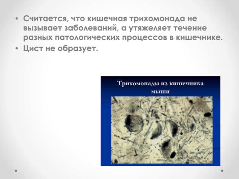 Слайд 20Считается, что кишечная трихомонада не вызывает заболеваний, а утяжеляет течение разных