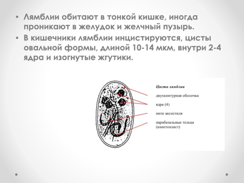 Слайд 13Лямблии обитают в тонкой кишке, иногда проникают в желудок и желчный