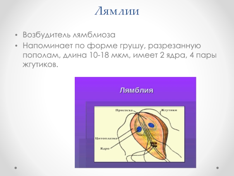 В кишечники лямблии инцистируются, цисты овальной формы, длиной 10-14 мкм, внутри 2-4 ядра и изогнутые жгутики.