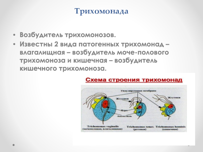 Известны 2 вида патогенных трихомонад – влагалищная – возбудитель моче-полового