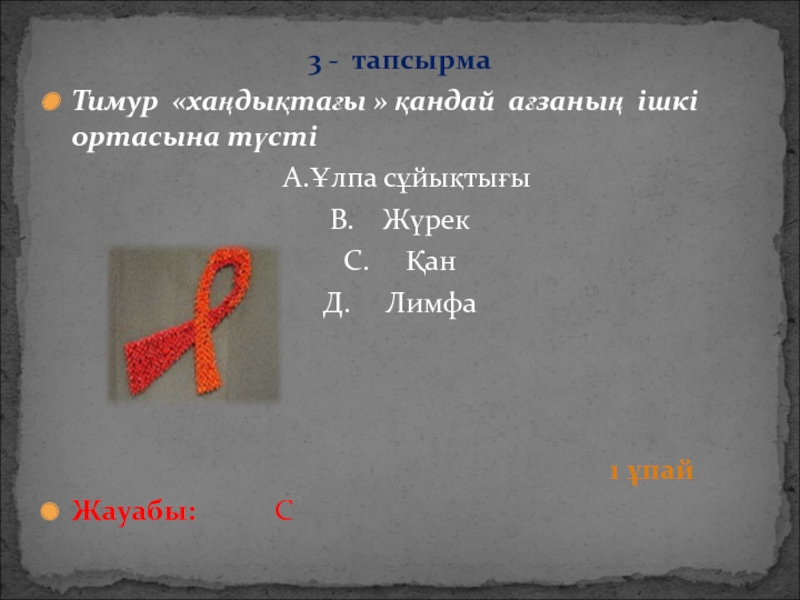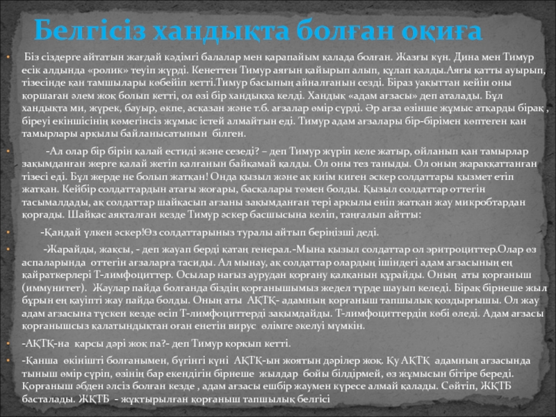 -Жарайды, жақсы, - деп жауап берді қатаң генерал.-Мына қызыл солдаттар ол эритроциттер.Олар өз аспаларында оттегін ағзаларға тасиды. Ал мынау, ақ солдаттар олардың ішіндегі адам ағзасының ең қайраткерлері Т-лимфоциттер. Осылар нағыз аурудан қорғану қалқанын құрайды. Оның аты қорғаныш (иммунитет). Жаулар пайда болғанда біздің қорғанышымыз жедел түрде шауып келеді. Бірақ бірнеше жыл бұрын ең қауіпті жау пайда болды. Оның аты АҚТҚ- адамның қорғаныш тапшылық қоздырғышы. Ол жау адам ағзасына түскен кезде өсіп Т-лимфоциттерді зақымдайды. Т-лимфоциттердің көбі өледі. Адам ағзасы қорғанышсыз қалатындықтан оған енетін вирус өлімге әкелуі мүмкін.